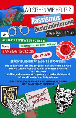 Eine Veranstaltung mit Berichten und Interviews mit Betroffenen: dem Polizei-Hundesbissfall und dem heute jugendlichen Sinto aus Singen, mit Stellungnahmen und Analysen unter anderem, von der bundesweiten Melde- und Informationsstelle Antiziganismus MIA aus Berlin.